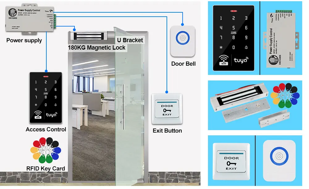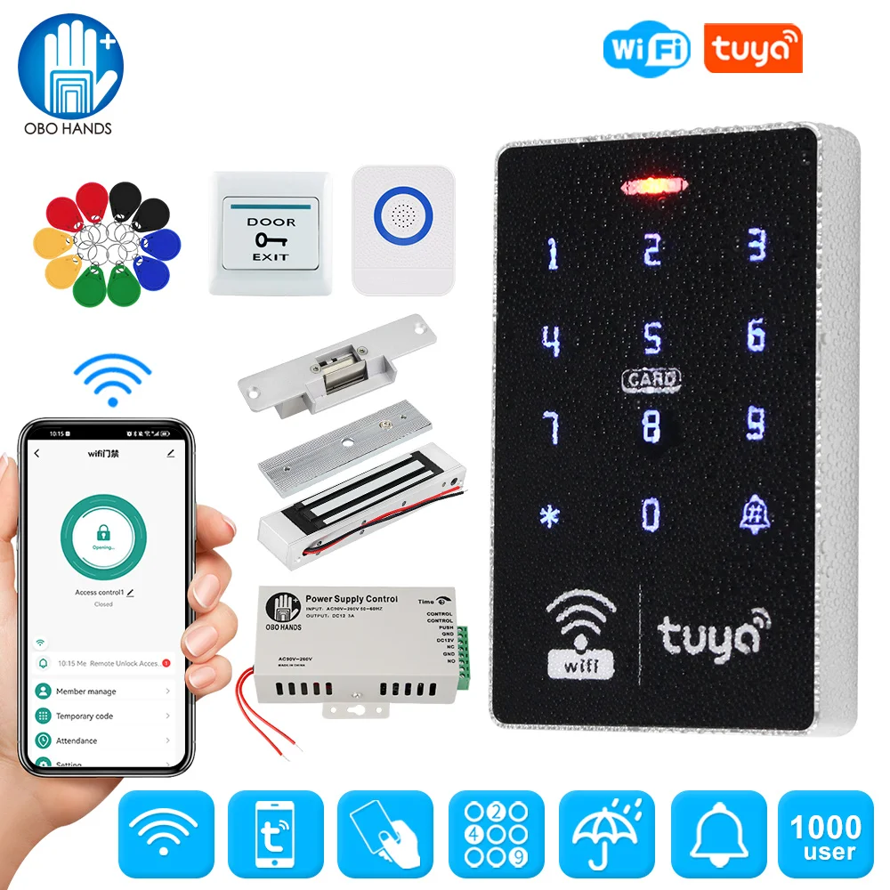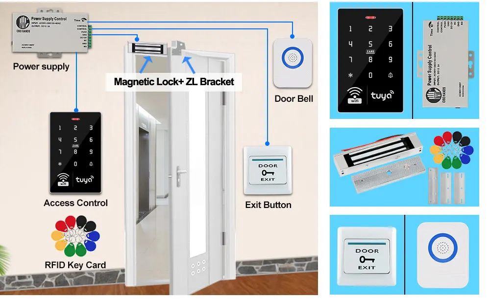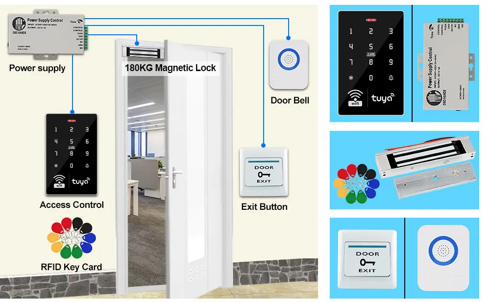 2.4GHz Wifi Tuya APP Smart Door Access Control System Kit Set Waterproof RFID Keyboard Access Controller, Electric Magnetic LocksA complete set of entrance guard system for wooden doors, iron doors and glass doors, which you can choose according to the type of your door. If you don't know how to choose, please contact us after taking a photo of the door, thank you. Product Description Access ControllerIP68 Waterproof Wifi Tuya APP RFID Access ControllerWifi Tuya APP / RFID Card / Password / RFID Card + Password unlock methodsUser capacity: 1000 userMaterial: ABS high quality materialPanel: touch screen panelWorking frequency: 125KHz and 13.56MHzCard reading type: support EM and MF 1K compatible cardCard reading distance: 0-5CMldentification method: RFID card, Password, RFID Card plus Password, Tuya APP remote unlock.Record capacity: Tuya APP remotely view the latest lock opening informationBacklight: has blue backlightWaterproof function: IP68 waterproof, can be installed outdoorDoorbell button: support wired doorbellWiegand signal: WG26/34 outputWorking voltage: DC 12VWorking current:≤3ADoor opening time: 0~99 secondsCan set Management card: YesWorking temperature: -20 ~ 70 Degrees CelsiusWorking Humidity: 10% ~ 90%Product size: 115*72*17mm Product Details:About Tuya APPYou can add Password, RFID cards on the APP, it's very convenient.You can open the door with Tuya APP unlocking button, or Tuya password.A periodic password can be set, and the password is valid for a certain period of time.You can also set a one-time password to open the door, and the password will expire after being used once within 6 hours.Supports sharing password via WeChat, Email and SMS.Can view unlock records. Click reminder information to view logs.Tuya APP Setting Instruction1) Scan QR code to download Tuya APP or Search Tuya on App store to download it.2) Enter *123456 # 041# on the access control machine, wait for 5 seconds for the indicator light to flash and start pairing, pair with the mobile phone via WiFi.3) Open Tuya APP to add new equipment.4) Select "Camera & Lock", click "Lock(Wi-Fi)".5) Connect with available devices. Choose Wi-Fi and enter password.6) Confirm that the device indicator flashes and click "Done".7) Select "AP Mode".8) Connect mobile WiFi to device hotspot.9) Connecting, Added successfully, click "Done"10) Click setting, open remote unlock setting.11) Select user, click "+" to add user, fill in name, click next step, then click “Add" to input 6 digits code or generated code randomly, fill in code name or card name, click "Save".12) Swiping one card within 60 seconds, add card successfully, then fill card name and click "Done".13) Then input the related information and click "Next step".14) Add temporary code, click "Once" , input code name, click "Save offline code" , Done.Notice: The code valid time for 6 hours and only can be used once.15) Add ordinary user by clicking ordinary member “+”.Support Tuya APP remote unlockYou can hold and press the unlock icon to open the doorSupport Temporary password unlockYou can set Tuya APP temporary password. Supports sharing password via WeChat, Email and SMS.Support RFID Card, Password, RFID Card plus Password, Tuya APP to open the doorSupport 1000 RFID card and password user capacity.Can set Management card, very easy to program.Don't need to connect on computer.Management cards was not included in the package, need to set them by yourself.ABS fire retardant material shellTouch keyboard, very beautiful design. Has a door bell button, can install a wired door bellCan set normally open mode.Frequent entry and exit can be set to normally open model IP68 Waterproof. Can be installed outdoorWith Full PC Glue in the back side, IP68 Rating, can work in the rain and stormBlue Backlight keypadThe digits number can be seen clearly even at darkEasy installation and operationBased on advanced technology, fast recognition speed, high sensitivity.Suitable for most major access control solution. Power Supply: This is AC110-260V, DC12V/3A power supply switch for access control system. Can connect to all kinds of access controoler, electric lock, exit button, remote control, etc. Help to reduct the overload of the access controller. NC/NO output mode cam be selected for different types of electric lock.Model Name: K803A Material: SteelInput Voltage: AC110-260V Input Frequency: 50-60HzOutput Voltage: DC12V/3A Output Power: 36wDimension: 105*91*34mm Time Delay: 0-15 seconds Door Exit Button:Material: Hard PlasticMaximum Power Rating:36V DC 3A—5A outputSupport both NC Mode (Fail Safe Mode) &NO Mode (Fail Secure Mode)Dimension:86X86MM ( L / W ) RFID Keyfobs:13.56MHz frequency RFID keyfobsOperating frequency: 13.56MHzDetection range: 0-5cmEach card pre programmed and has a metal keyring.Please Noted: There are 5 color of the RFID keyfobs for optional (blue, red, yellow, green, black). We will send mix color by default. If you need other color, please leave message to us. Package List Kit1: Including RFID access control keypad + 10pcs keyfobs. Not including power supply, electric lock, door bell, door exit button.Kit2: Including RFID access control keypad + 10pcs keyfobs+ Power supply+ Door exit button+ Door bell. Not including electric lock. Kit3: Suitable for wooden door, metal door. convenient and beautiful. No need bracket.Package including: Access Control keypad + Power supply + NC type Electric Strike lock + Exit button + Door bell + 10pcs Keyfobs(We will send the NC type by default, if you want NO type, please leave us a message.) Working Voltage: 12V ± 10%Current: 200mA – 450mAHolding Force: 500kgSurface Temperature: Lower than room temperature +20Working Temperature: -30-+60 Celsius DegreeOperating Humidity: 0~90%(non-condensing)Feature:Fail secure (NO), Fail safe(NC)Material: Stainless steelNC type strike lock: Locked when power on, unlocked when power offNO type strike lock: Locked when power off, unlocked when power onSize: 150 x 28 × 34mm(L 
