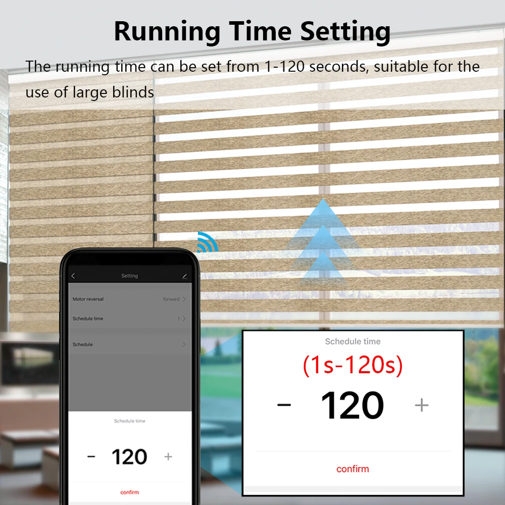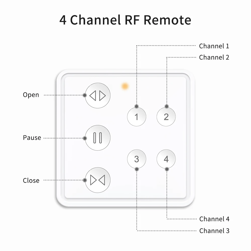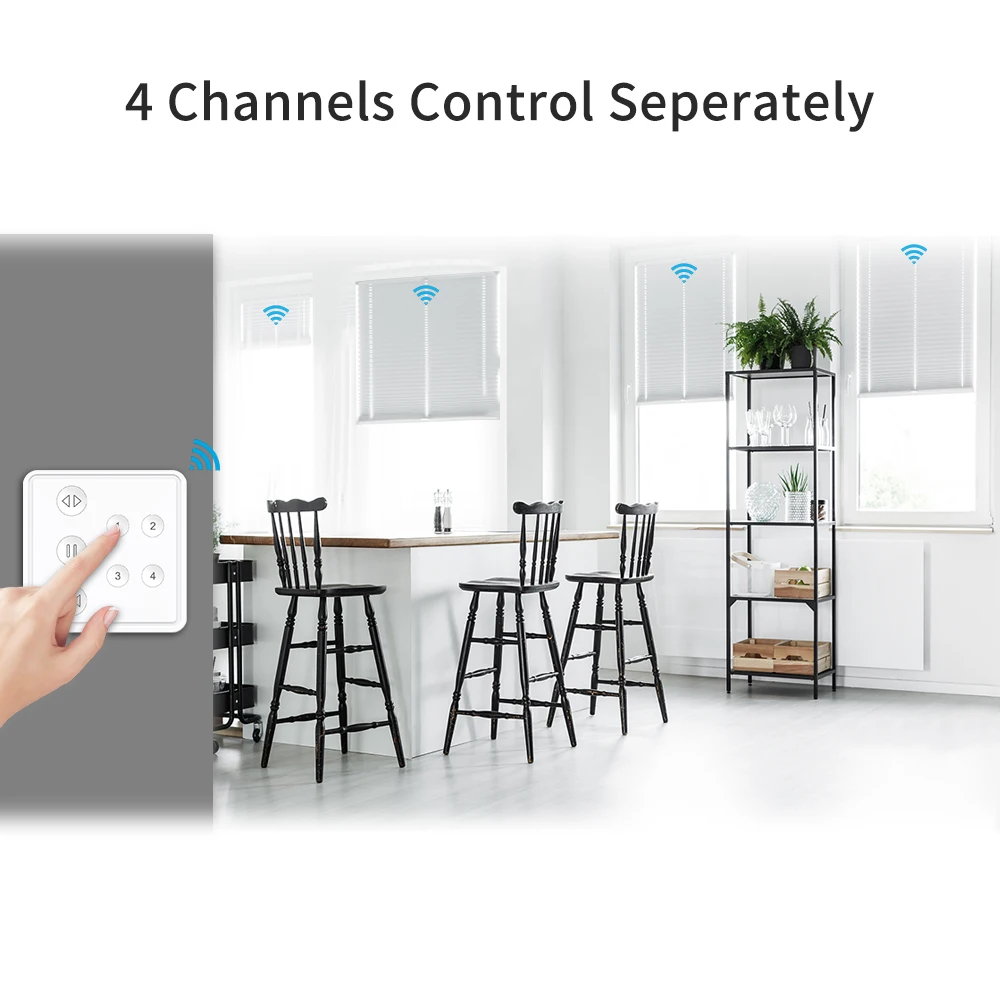 Note before order:- Please check your motor is with 4 wires (Blue Wire, Brown wire, Black Wire, Green/Yellow Wire) before you buy our.- Before using App to control the shutter, please keep the wall manual switch at 'STOP' position, otherwise , the App can't work, it's to protect the motor.WiFi Shutter Switch Module with RF 4 Channel Remote Control Switch• RF 4-Channel Remote Control: – Use a Manual Remote to control the curtain blinds, ( Open, Pause, Close) Control Range up to 30m- You can use a 4-channel remote control to control 4 blinds in your home separately.- Built in RF module, enable you can remote control your blinds shutter even if you have trouble with WIFI.- The remote is with a wall mount, you can also mount it on wall where would be convenient for you.• Voice Control: Voice control the curtain switch ON/OFF by Alexa & Google Assistant at home.• App Name: Tuya, Smart Life; Free App, Support Android and IOS.• App Remote Control: Mobile app remote control to open or close curtain.• Running Time Setting: The running time can be set from 1-120 seconds, suitable for the use of large blinds.• Timer Function: You can set a timer to open or close the curtains at a specified time.• Wall Switch Control: After you install this module, your wall manual switch still works, it can open, or close the shutter.• Personalize Scene Settings: With Smart Life scene settings, you can flexibly set your curtain status according to sunrise, sunset or weather conditions.• Group Control: You can create groups to batch control multiple curtain in your home through the group feature.• Sharing Function: You can share the device to your family members for common use.SpecificationInput voltage: 100-250 VAC, 50 / 60HzWiring: Neutral Wire, L1, L2, Earth WireMax Load: 300 WWi-Fi Standard: 2.4 GHz 802.11 b / g / n (Not support 5Ghz)RF Wireless Frequency: 868MhzStandby Consumption: below 0.5WDimensions: 48mm * 47mm * 22mmWhat's in the box?1 * 4 Channel Remote Control4 * RF+WiFi Curtain Switch Module3 * Cable for Wiring1 * Double-Sided Tape1 * User Guide